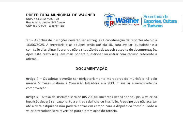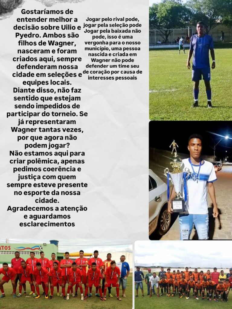 No Regulamento da competição o qual tivemos acesso (Wagner em Foco), em seu Art. 4, Item Documentação, não permite que atletas que não residam em Wagner participem da copa, onde se enquadra os dois atletas que atualmente trabalham e residem em outra cidade.